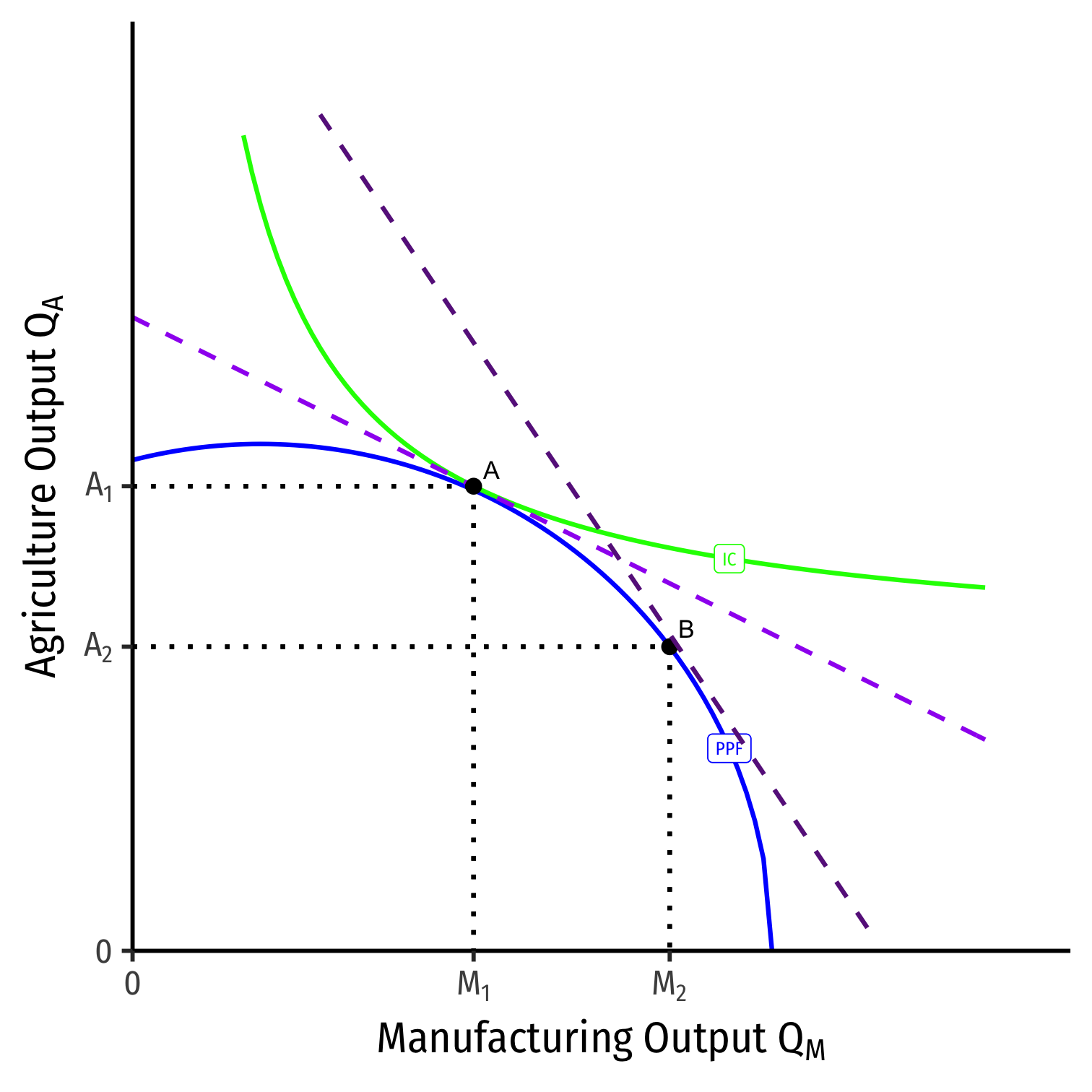 At the optimum production, PPF is tangent to a value line with slope the relative price of M